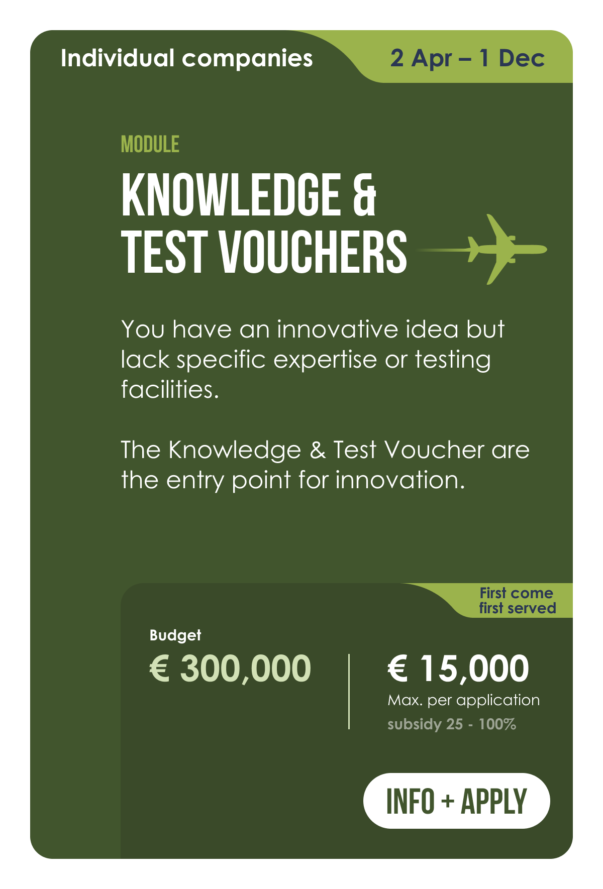 The LiT Open Calls project is designed to support the technological development required for the transition to sustainable aviation. It also aims to expand and strengthen the SME ecosystem within the Dutch aviation sector. While most LiT projects are carried out by established consortia working on specific projects and challenges, LiT Open Calls annually opens modules to startups, SMEs and knowledge institutions, enabling them to apply for funding for projects that contribute to the transition to sustainable aviation. The four modules each have different scopes and objectives. This scheme and its modules are issued and administered by the Netherlands Enterprise Agency (RVO).