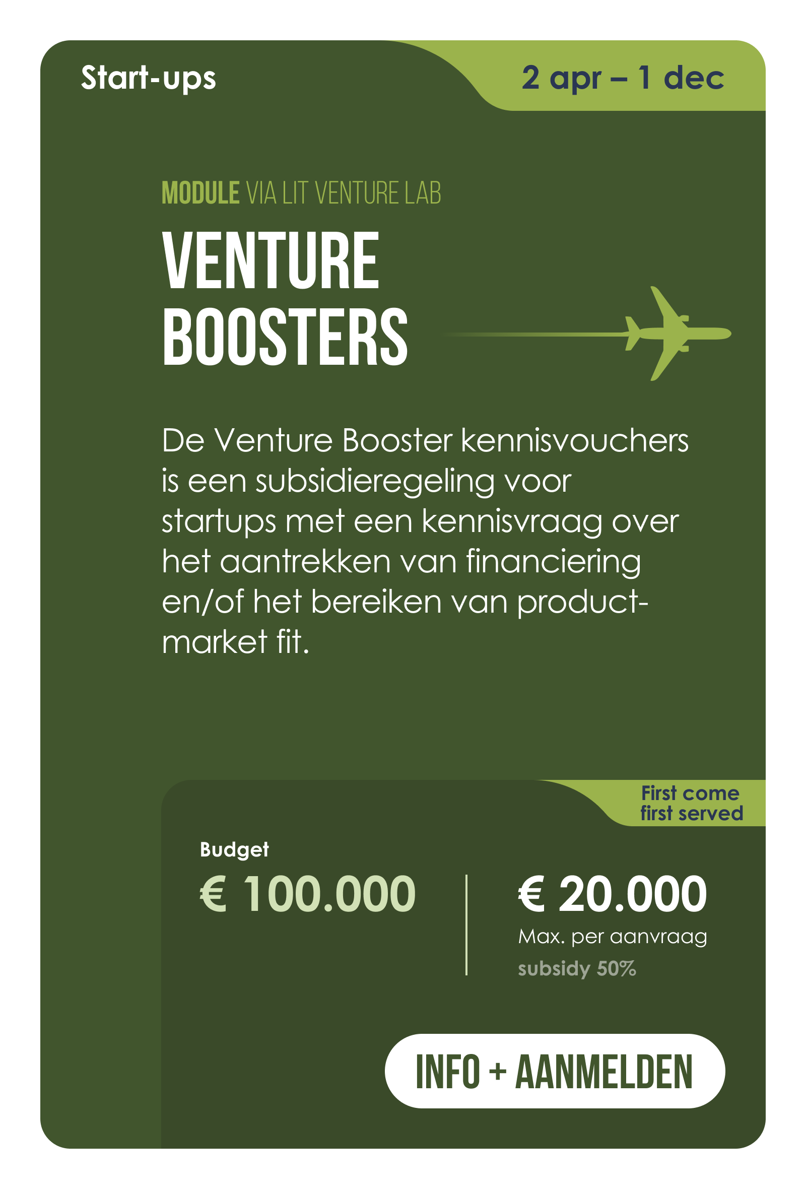 Het project draagt bij aan een duurzame luchtvaart door startups te ondersteunen die werken aan baanbrekende technologieën en innovatieve oplossingen. Door hen te helpen met financiering, netwerkverbindingen en marktvalidatie, wordt de kans vergroot dat nieuwe technologieën daadwerkelijk op de markt komen en de luchtvaartsector verduurzamen. De subsidiemodule Venture Boosters kan je helpen met een kennisvraag over financiering of het behalen van product-market fit. Daarnaast zorgt de systemische benadering van het LiT Venture Lab ervoor dat niet alleen vliegtuigen, maar ook de infrastructuur, wet- en regelgeving en inpasbaarheid van nieuwe vliegtuigen en vliegtuigsystemen worden meegenomen in de transitie. Dit versnelt de acceptatie en implementatie van duurzame innovaties en maakt de sector toekomstbestendiger.